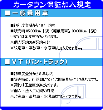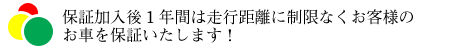 一般車につきましては、加入後一年間の走行距離無制限保証で、商用車の場合は、加入後5万kmまでの走行距離内が保証の対象となります。(一般/商用いずれも加入後2ヶ月間は免責期間となります。)